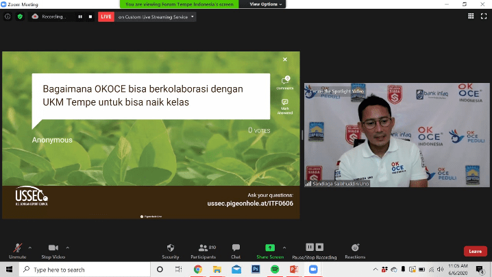 The talk show moderated by Dr. Dadi Maskar, USSEC Indonesia, featured three experts: Professor Made Astawan, ITF Chairman; Mr. Aip Syarifuddin, GAKOPTINDO Chairman, and Mr. Sandiaga Uno, a successful young entrepreneur and the former Deputy Governor of Jakarta before he resigned the office to run for Vice President during the 2019 Indonesian presidential election. A virtual cooking demo on tempe was conducted at the end of the session by Chef Adam, a young celebrity chef in Indonesia.