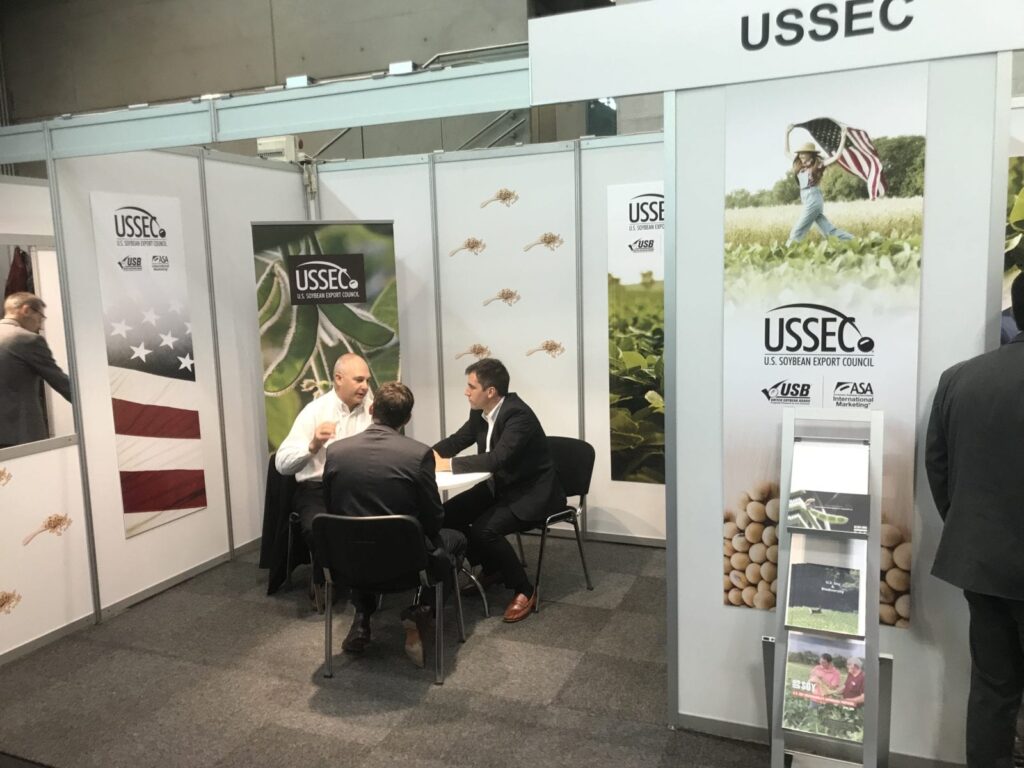 USSEC Regional Director – EU / Middle East North Africa (MENA) Brent Babb and USSEC consultants Lola Herrera and Albert Roda attended to customers at the USSEC booth providing information on U.S. soybeans and soybean meal, related to quality, with an emphasis on sustainability and U.S. Soy Sustainability Assurance Protocol (SSAP) sustainability certification for U.S. origin soybeans and soybean meal.
