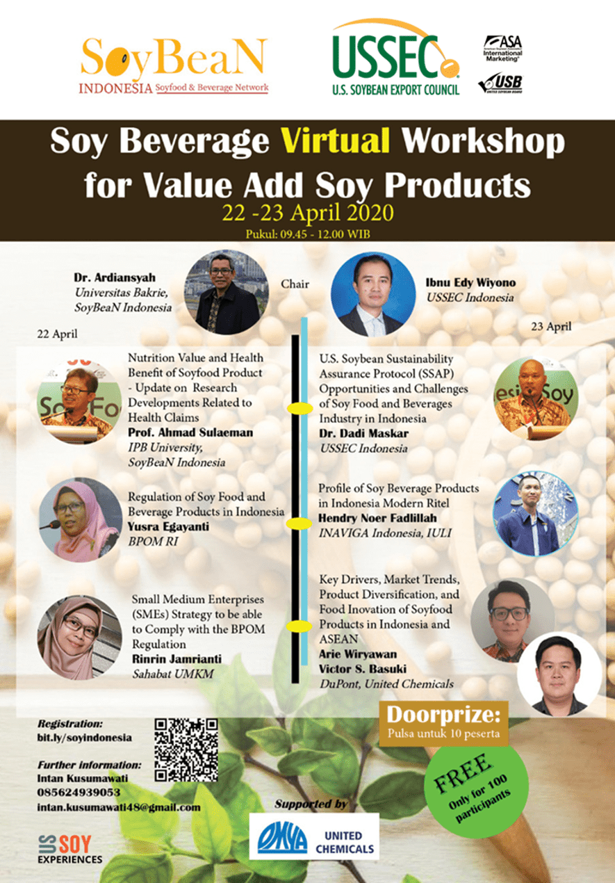 The two-day “Soy Beverage Virtual Workshop for Value-Added Soy Products” was a collaborative effort between USSEC and the newly inducted Indonesia Soy Food Beverage Network (SoyBeaN), an organization that USSEC was privileged to assist set up. The workshop was well received and attended by more than 120 participants including food regulators, food scientists, small and medium sized enterprises (SMEs), and food enthusiasts, as well as cottage scale soy beverage producers from all across the country.