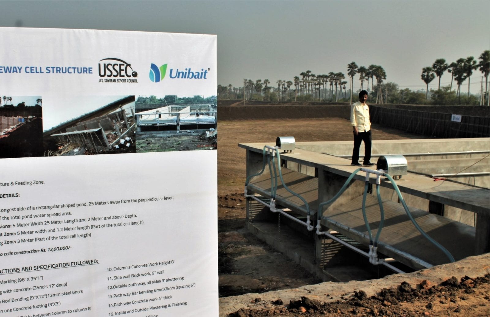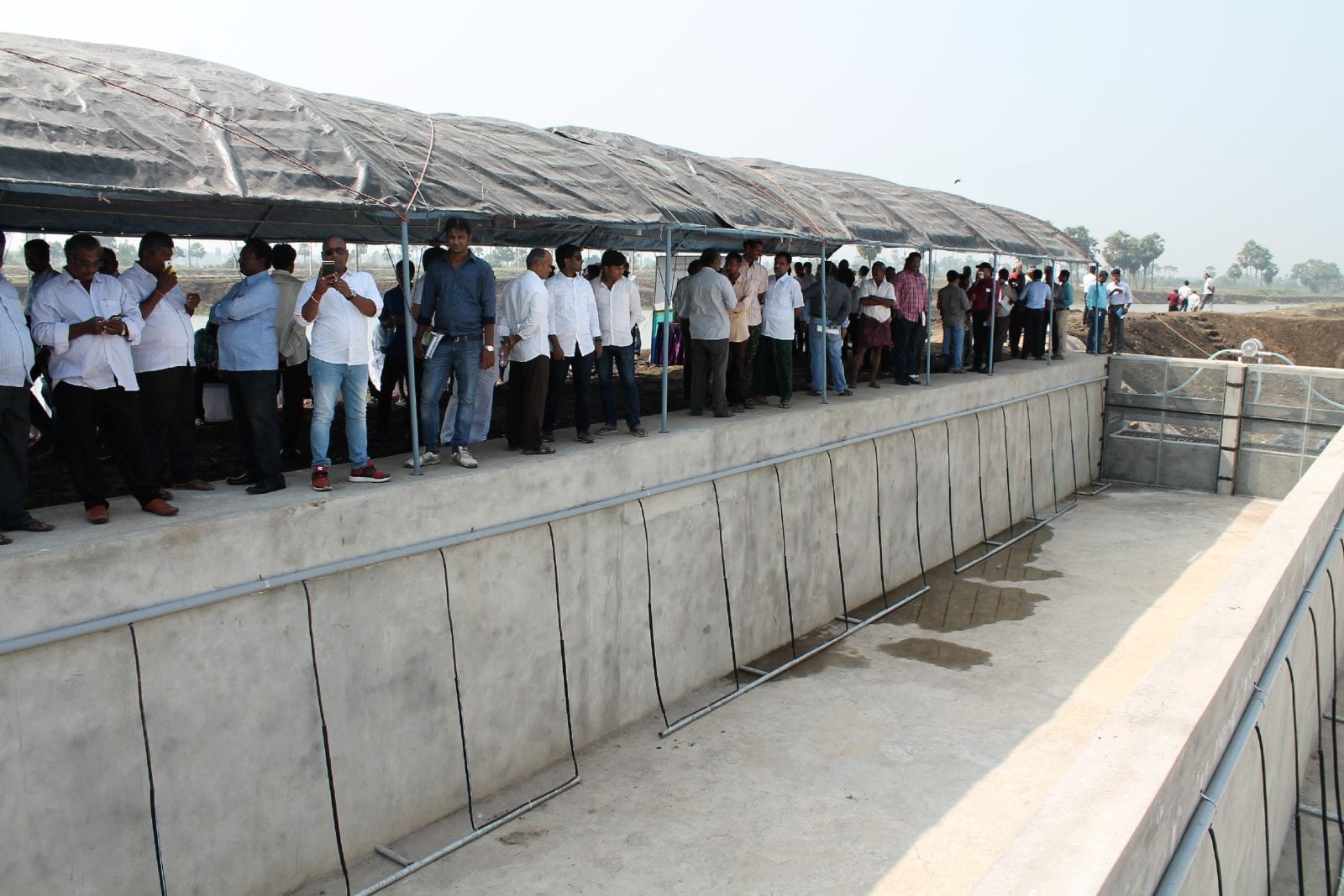 The first IPRS in India / Asia Subcontinent (ASC) region was funded by USSEC’s World Wide Aquaculture project and was completed in September 2017, in association with its Indian cooperator Lusot Aqua / Unibait Feeds. After allowing the construction structure to be completed and after conducting a few fluid dynamic calculations, USSEC India and Lusot Aqua conducted a field day to popularize this new technology to aqua stakeholders who traveled from ten Indian states. About 150 participants attended the field day on January 10. Most potential investors were extremely interested in the construction and operational details. USSEC and Lusot Aqua also conducted a seminar / discussion forum at the site, which helped share more technical details about the project. The TV channels and press present at the Field Day provided wide coverage of the technology.