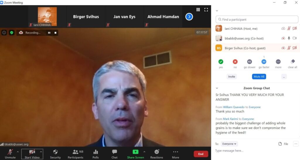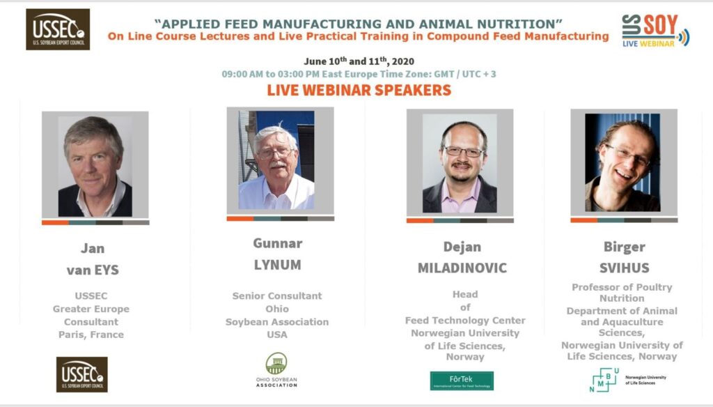 Through the presentation “World and EU Feed Production: Past, Present, and Future,” USSEC consultant Dr. Jan van Eys kicked off the event agenda and introduced information about the EU’s livestock production, feed market, soy usage, and the critical role of U.S. sustainable soy and soy products. Future challenges in supplying sustainable raw materials for animal feed manufacturing were presented by Dejan Dragan Miladinovic, the head of Norway’s FôrTek Feed Technology Lab. The first panel of the online training was closed by Dr. Birger Svihus, professor at the Norwegian Live Sciences University, who discussed the role of feed processing in animal production.