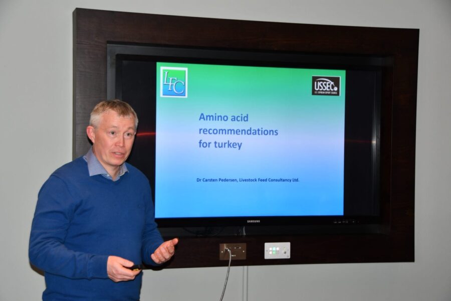 Emily Marshall, Poultry Coordinator at Alltech UK, welcomed the USSEC group and gave presentations delivering the latest updates on gut health for poultry and turkey production. The audience was informed of the importance of gut health as the first line of defense for optimal poultry health and nutrition’s role in establishing efficient digestion, in the era of antibiotic-free production. USSEC consultants Dr. Jan van Eys and Dr. Carsten Pedersen introduced the role and advantages of U.S. Soy in efficient turkey meat production through technical presentations.