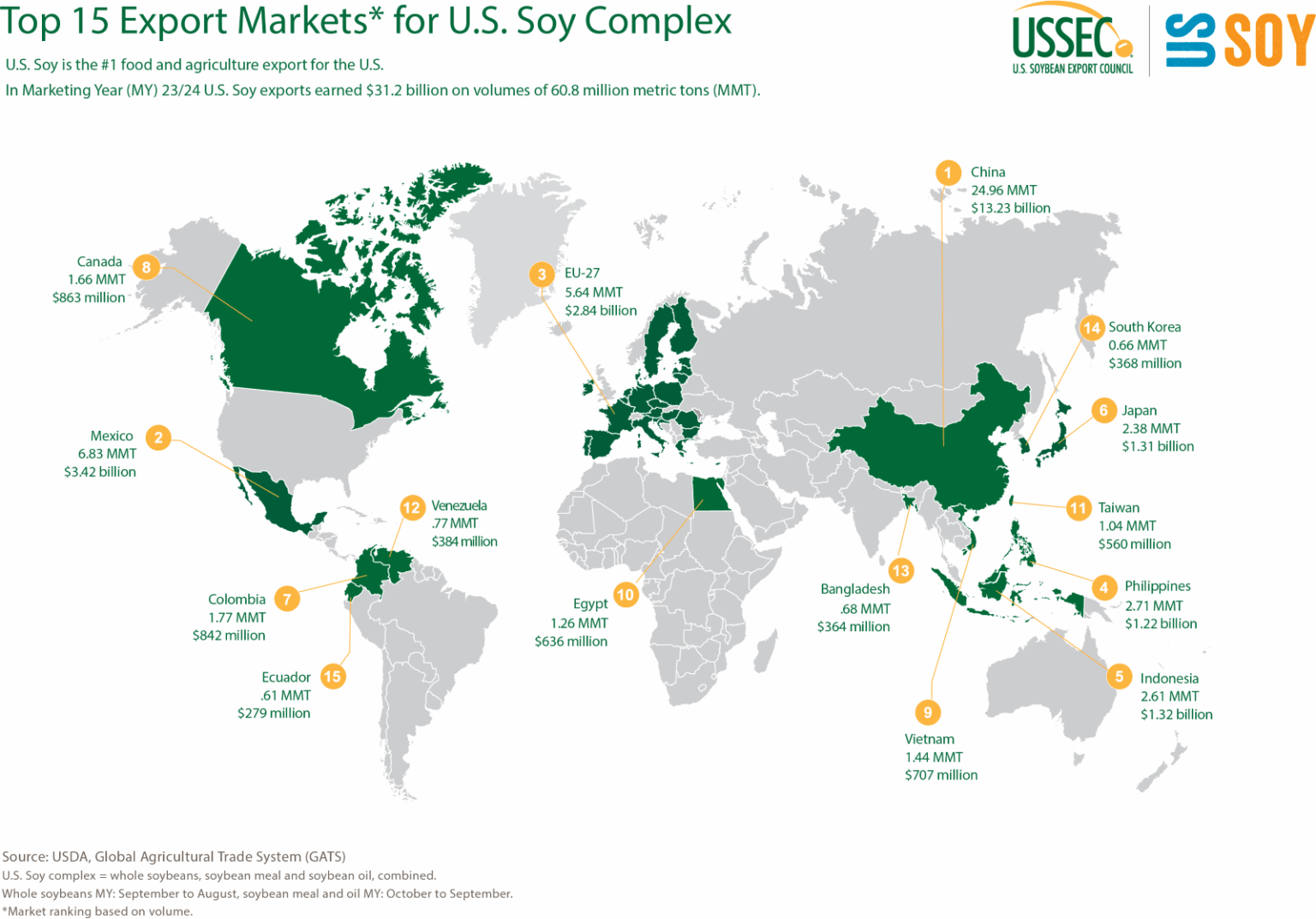 - Total U.S. Soy complex (whole bean, meal and oil), 60.8 million metric tons (MMT), valued at $31.2 billion.
