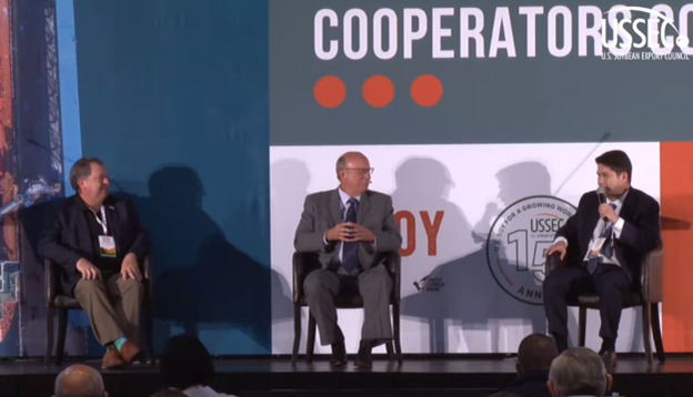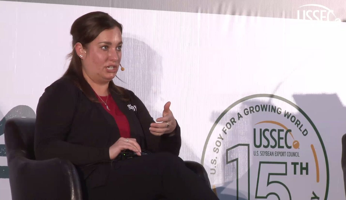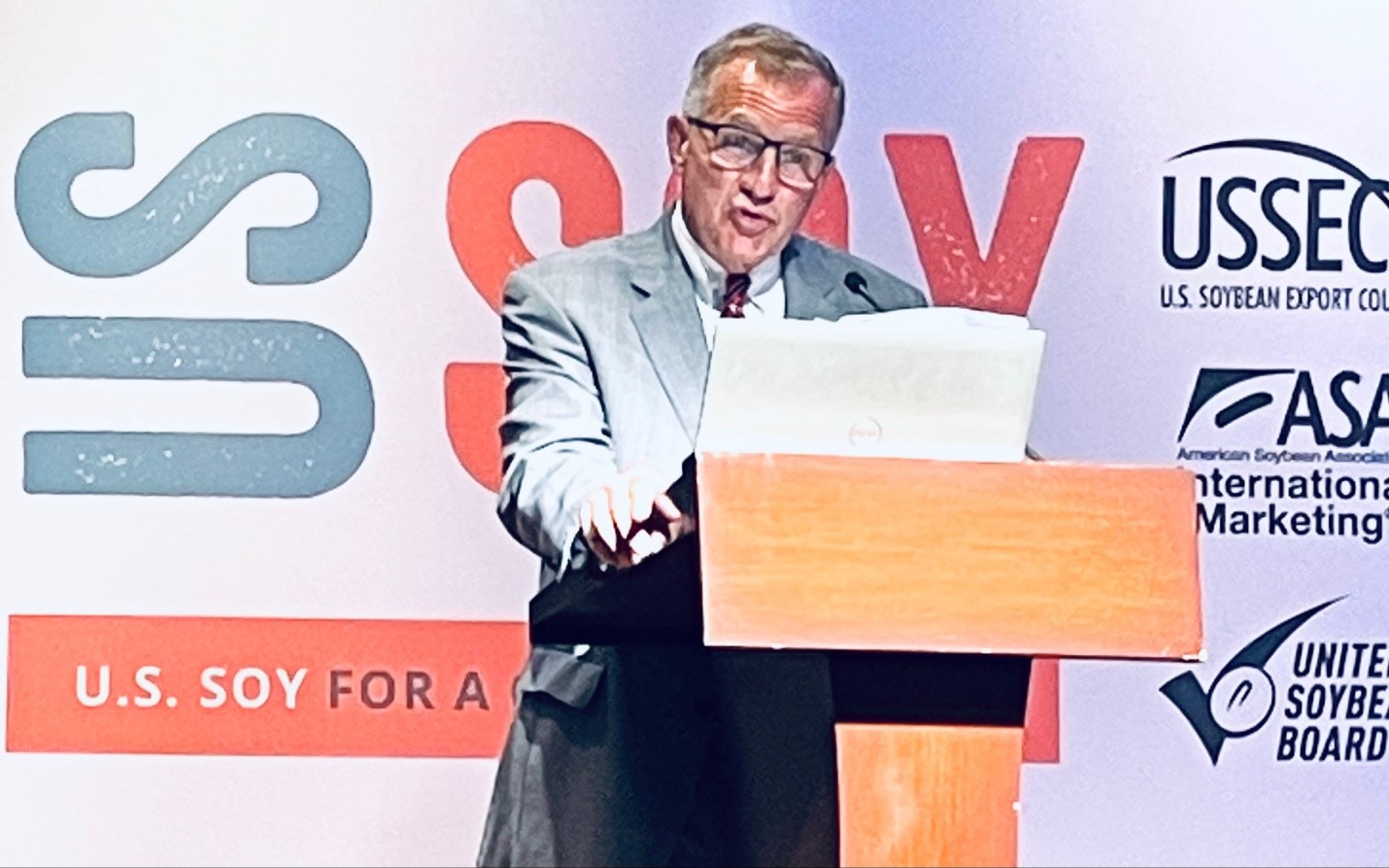 Doug Winter (pictured center stage), who serves as USSEC vice chairman and director for the United Soybean Board, also emphasized the importance of technology. Before travel shutdown due to COVID-19, Winter was already embracing technology to bring customers to his farm virtually, first connecting live during a 2017 conference and again at the 2020 U.S. Soy Global Trade Exchange, providing a tour of his farm.