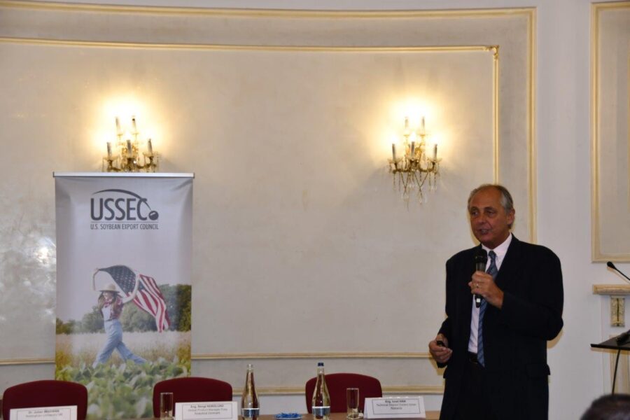 At a recent USSEC event for U.S. soy customers from Romania and Bulgaria, USSEC consultant Dr. Julian Wiseman addressed the opportunity for full fat soybean meal production and use in the particular context of Romanian and Bulgarian markets.