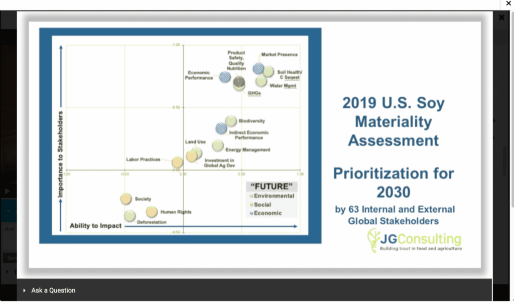 “Sustainability can be a market access issue or an opportunity,” stated Garrett. Mapping helps U.S. Soy in three main areas: responsibility to people and planet; to identify how to better manage operational and regulatory risk; and how innovation has been stimulated by these targets, which can help lead to expanding new growth markets. Mapping U.S. Soy to SDGs ensures the U.S. soy industry has a common approach.