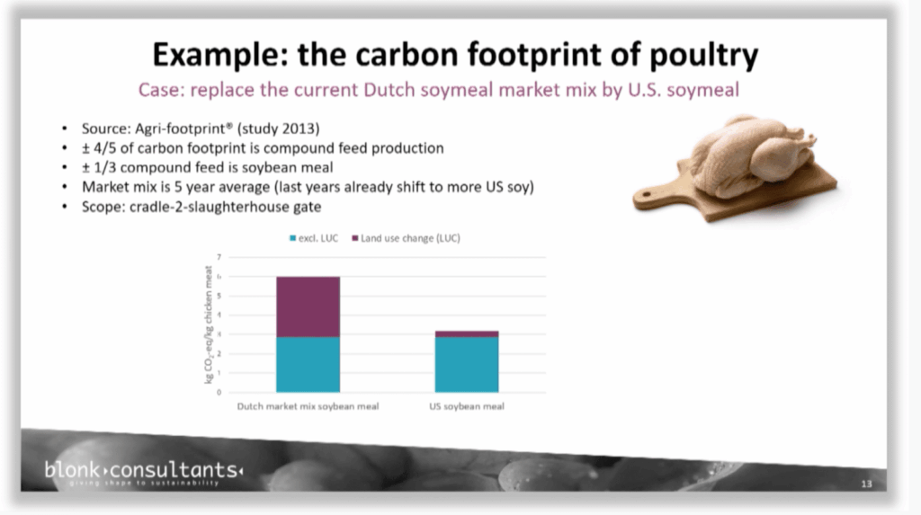 The impact of soy on animal production is another key factor when comparing carbon footprints of soy from different origins. In a case study from 2013, the then-current mix of Dutch soymeal market mix, made up of mostly Brazilian and Argentinian meals, was compared to the carbon footprint of U.S. soybean meal. Since that study was performed, Blonk said, the Netherlands has shifted to a mix with a greater proportion of U.S. soybean meal. “This is just an example to show you the impacts that soy can have on the carbon footprint of animal production,” Van Diepen stated.