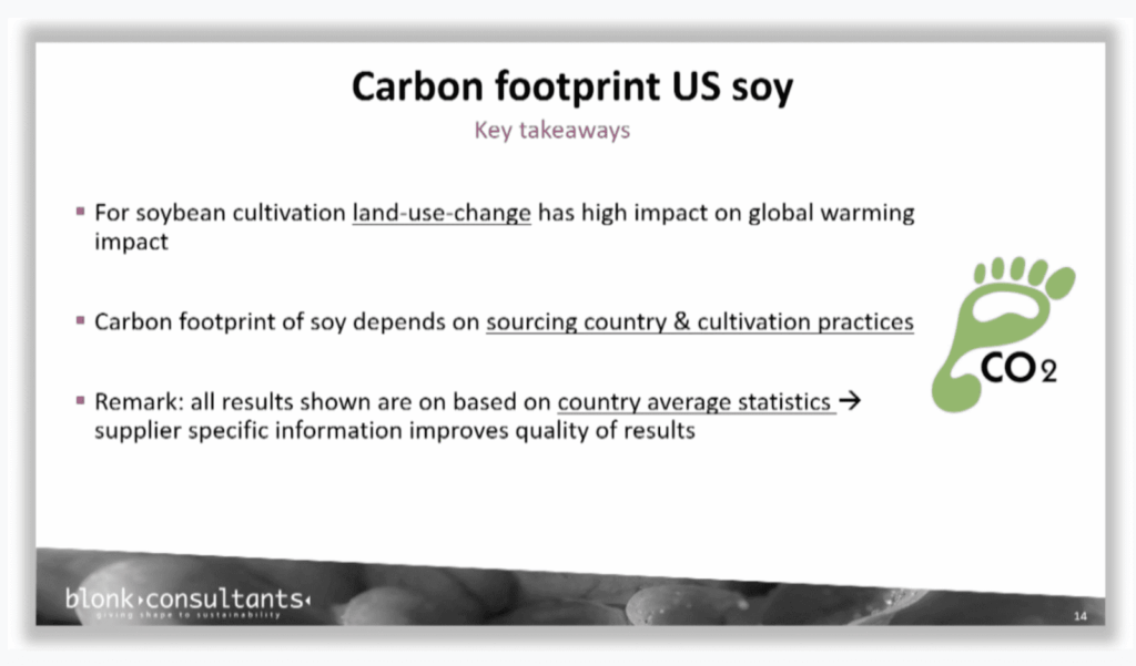 Janjoris Van Diepen, senior consultant at Blonk, presented participants with the results about the carbon footprint of U.S. Soy, explaining the LCA methodology and data and modelling used.