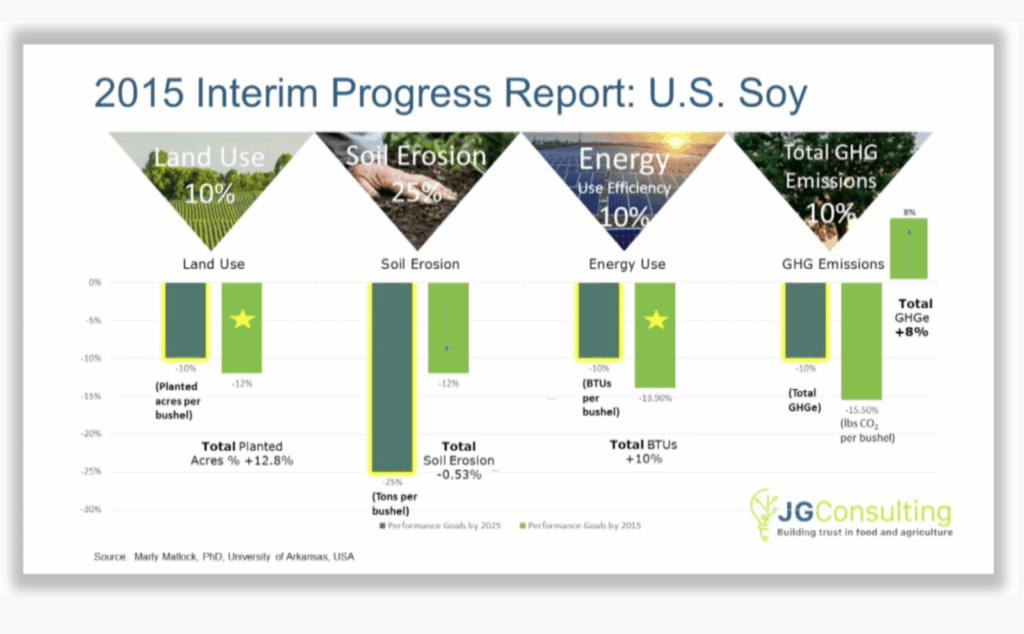 U.S. Soy has made considerable progress towards these goals. The land use goal was already exceeded in 2015; however, the industry is still making progress there. U.S. Soy is about halfway to its soil erosion goal and has exceeded its energy goals. For greenhouse gas emissions, efficiency has already made great progress and the industry is still working towards the total goal.