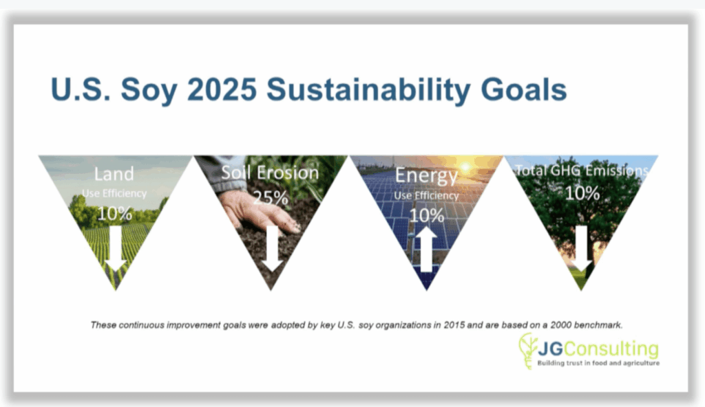 What is U.S. Soy doing now to help support that goal and target? Four goals, identified in 2015, already exist for U.S. Soy: continuous improvement in the areas of land use, soil erosion, energy, and greenhouse gas emissions between 2000 and 2025.